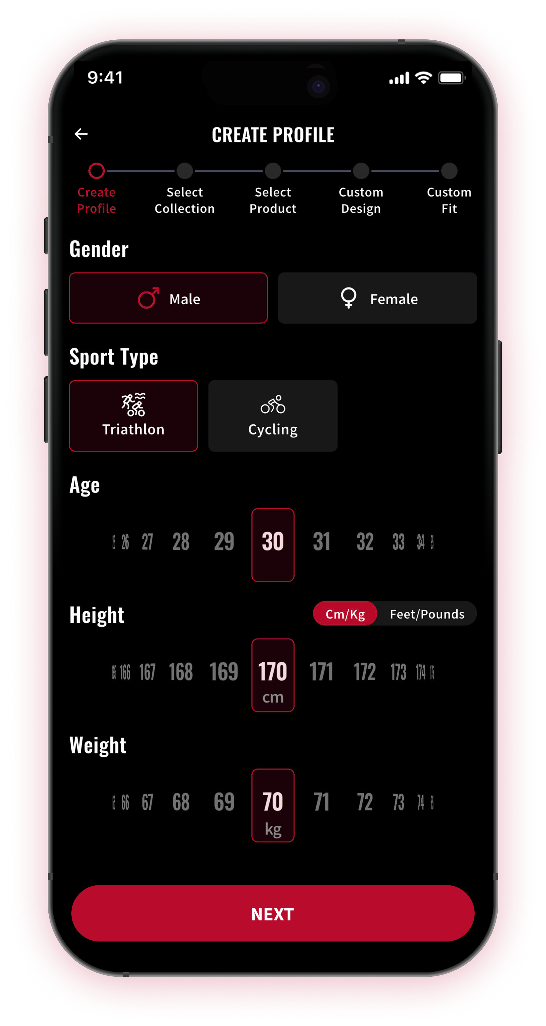 Complete your profile (Gender → Sport Type → Age → Height → Weight), then tap Next to continue.