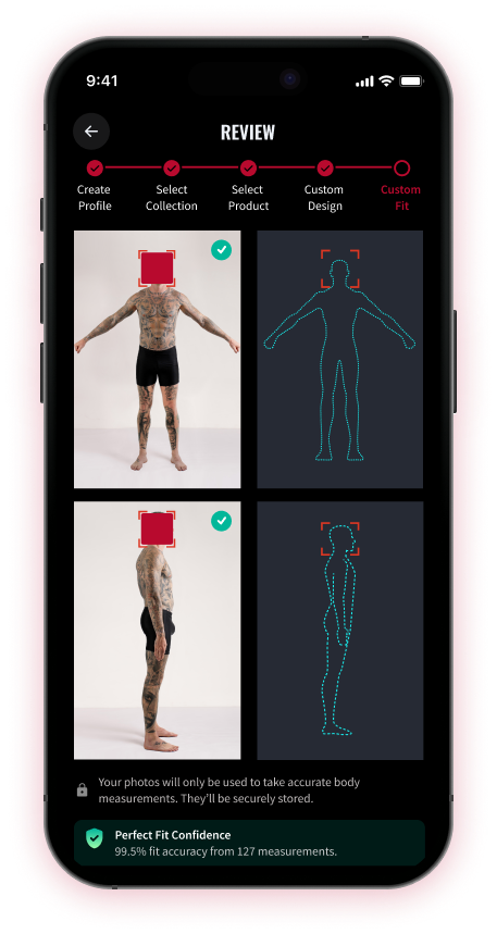- Follow the simple photo guide — our PHOTOtoFIT™ technology automatically calculates your exact measurements without manual measuring.